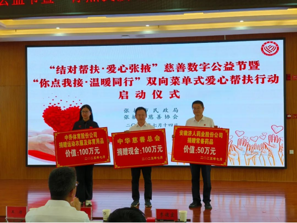 活動(dòng)儀式上,中華慈善總會(huì)向張掖市慈善協(xié)會(huì)捐贈(zèng)現(xiàn)金100萬元,中喬體育股份公司捐贈(zèng)價(jià)值100萬元的運(yùn)動(dòng)服和體育用品,安徽濟(jì)人藥業(yè)股份公司捐贈(zèng)價(jià)值50萬元的常備藥品。