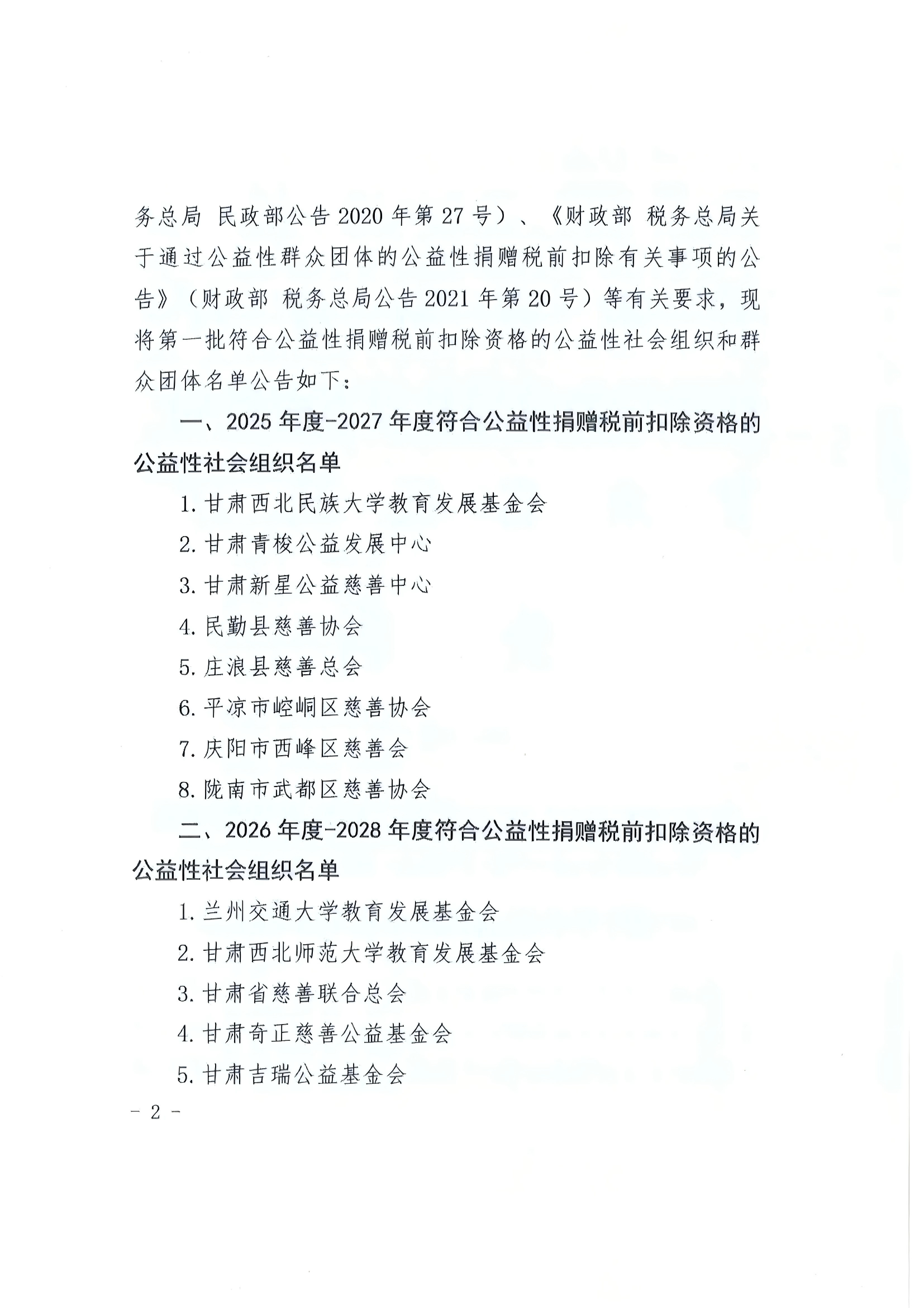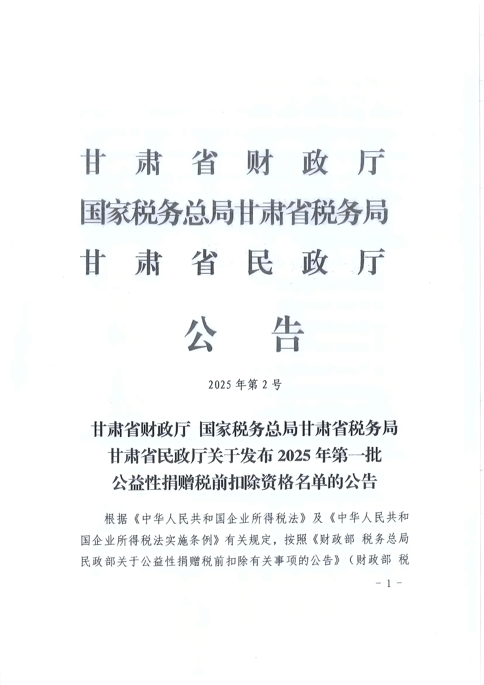 公告| 甘肅省財政廳國家稅務(wù)總局甘肅省稅務(wù)局甘肅省民政廳關(guān)于發(fā)布 2025年第一批公益性捐贈稅前扣除資格名單的公告